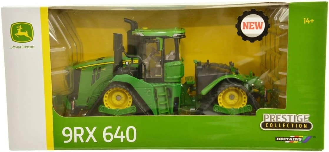 The all new 9RX comes with more power thanks to new ballasting options. It also has added pulling capacity and its total footprint is up to 119% more than wheels and 42% more than 2-tracks. The narrow transport width and 4-post cab suspension make moving between fields easy. The new cab is a great place to start a long day in the field. It feels like you’ve stepped into a premium luxury car. Britains model from the Prestige Collection has captured all details. Each track turns on its freely rotating drive wheel and idlers. Made of die-cast metal and precision moulded, durable plastic. Suitable for collectors aged 14 years and up.